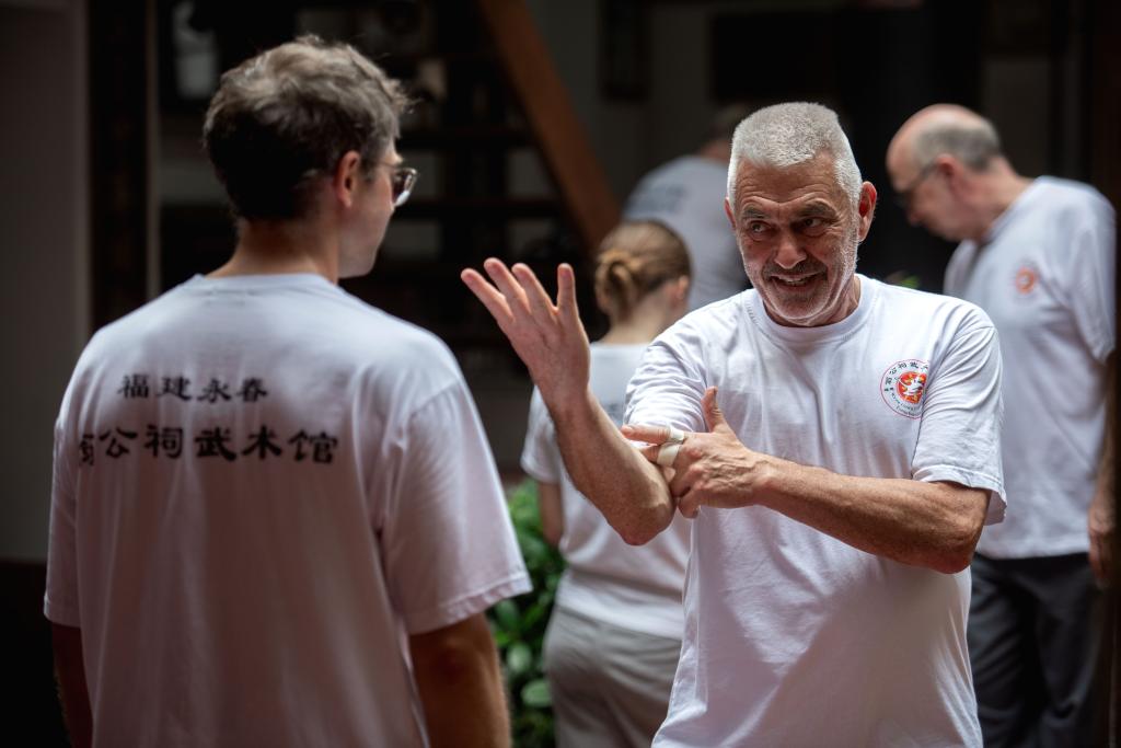 ↑10月17日,在福建省泉州市永春縣五里街鎮翁公祠武術館,來自德國的永春白鶴拳弟子習練永春白鶴拳。連日來,來自德國的11名永春白鶴拳弟子,不遠萬里,到福建省泉州市永春縣五里街鎮翁公祠武術館溯源尋根,習練永春白鶴拳。新華社發 (康慶平 攝)
