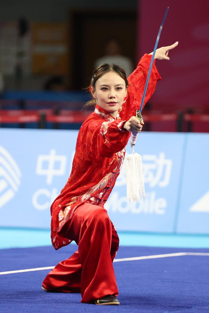 ↑11月7日,廣東隊選手梁壁熒在第十五屆全國運動會武術套路女子太極拳太極劍全能項目太極劍比賽中。新華社記者 楊世堯 攝