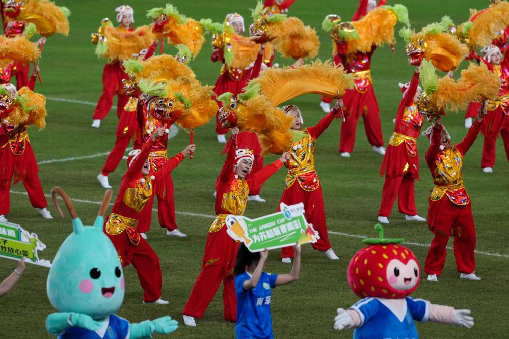 ↑10月18日,演員在江蘇南京舉行的2025江蘇省城市足球聯賽(“蘇超”)南京隊與泰州隊的半決賽中場休息時表演。新華社記者 李博 攝