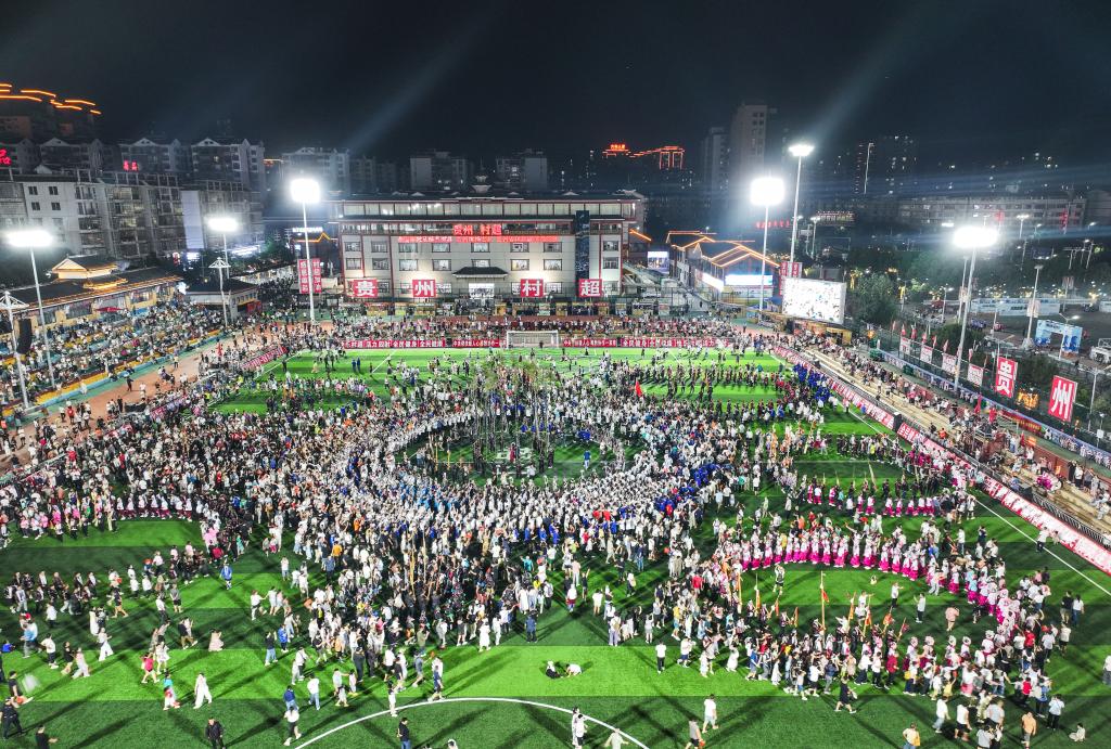 8月23日,人們在貴州“村超”球場跳苗族蘆笙舞(無人機照片)。