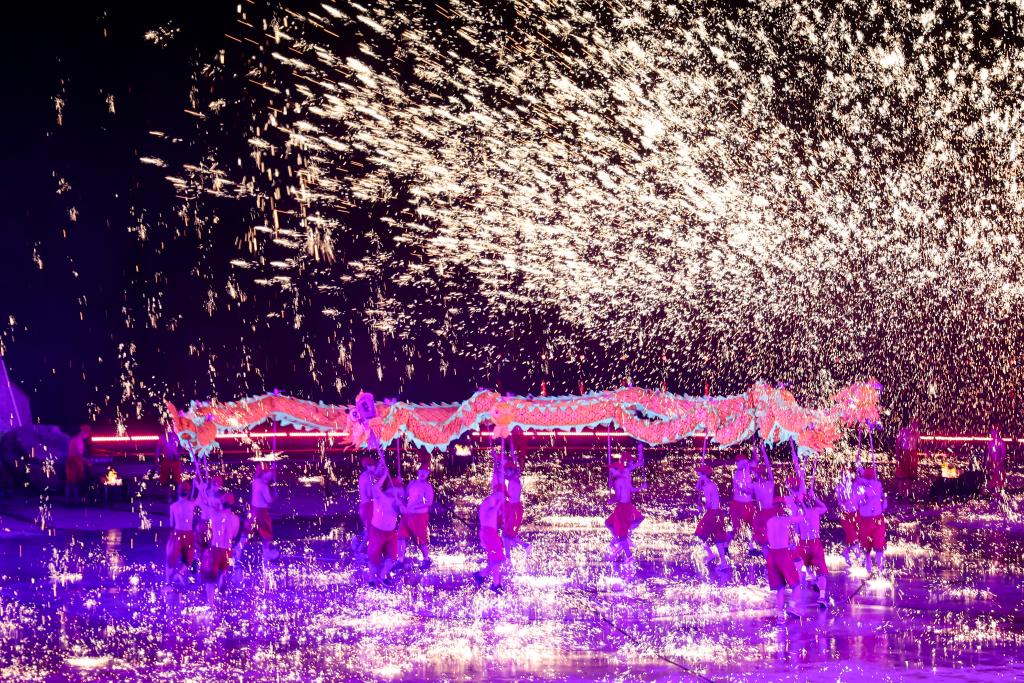 這是12月6日在銅梁區玄天湖龍舞廣場拍攝的《追夢·銅梁龍》演出現場。《追夢·銅梁龍》融合水雲龍、荷花龍、鐵花火龍等多樣龍舞。