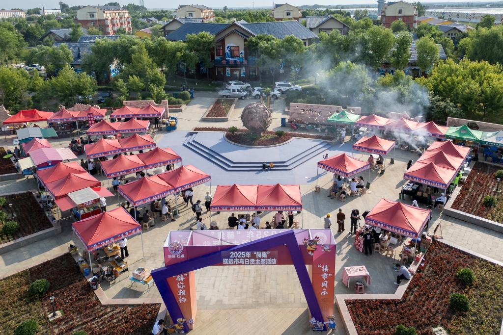 這是7月1日在“華夏東極”黑龍江省撫遠市拍攝的烏日貢主題活動現場(無人機照片)。