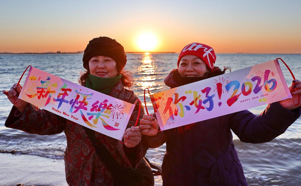 2026年1月1日清晨,市民在河北省秦皇島市海港區金夢海灣海灘觀看日出,迎接新年。新華社發(曹建雄 攝)