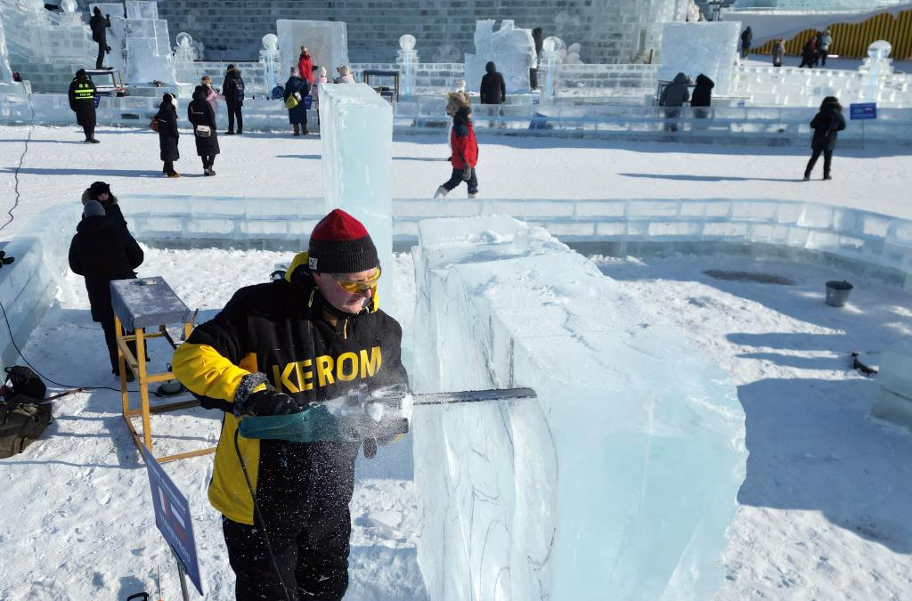 1月2日,冰雕師在哈爾濱冰雪大世界園區內進行冰雕創作。新華社發(劉洋 攝)