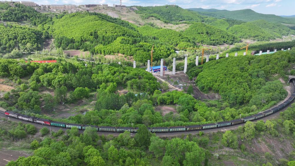 行駛在百年老線路上的一列進口貨物列車駛入綏芬河鐵路口岸,與遠處新建濱綏鐵路提質改造工程1號橋遙相呼應(2025年5月26日攝,無人機照片)。