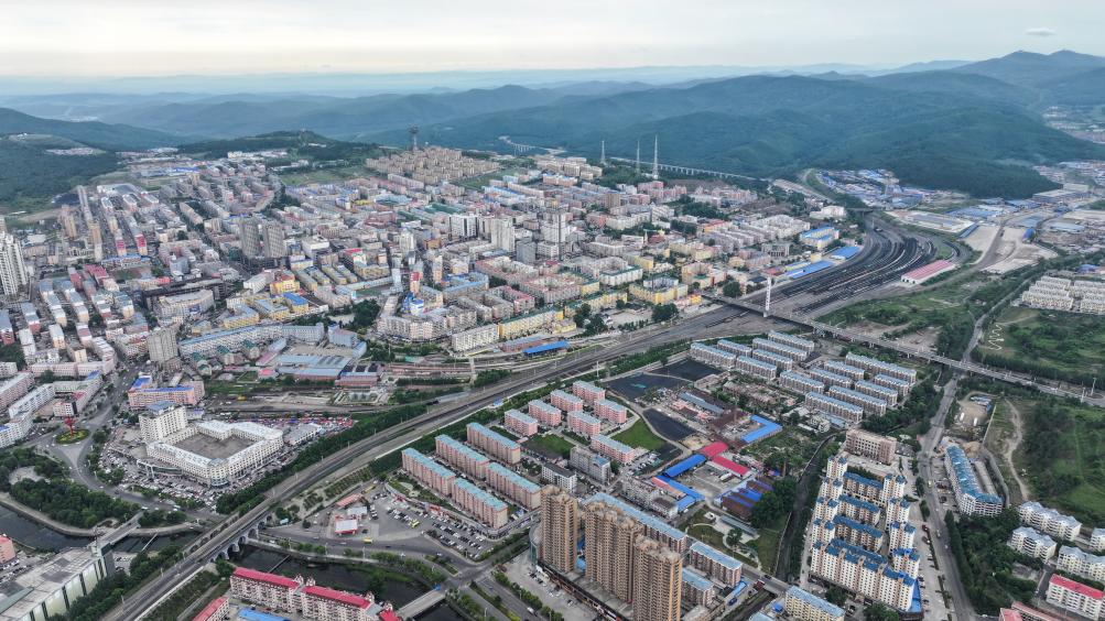 百年口岸黑龍江省綏芬河市,濱綏鐵路穿城而過(2025年7月13日攝,無人機照片)。