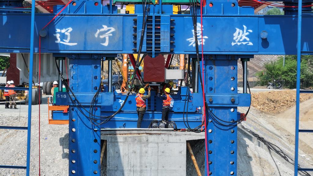 施工人員在架梁時上固定螺桿(2025年5月31日攝,無人機照片)。