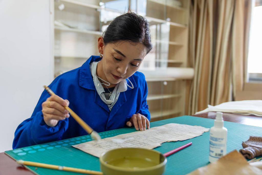 2025年8月13日,西藏自治區古籍保護中心古籍修復員次仁央宗在對古籍進行除霉。新華社記者 旦增尼瑪曲珠 攝
