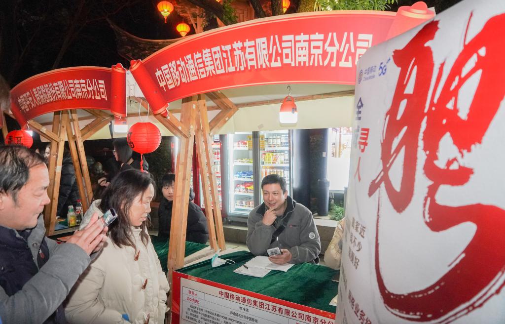1月9日,南京老門東景區“人才夜市”展位上,求職者與招聘人員交流。(劉臻睿 攝)