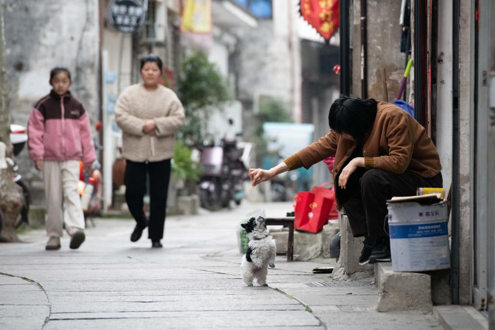 2025年3月23日,在安徽省黃山市歙縣徽州古城內,當地居民與小狗互動。