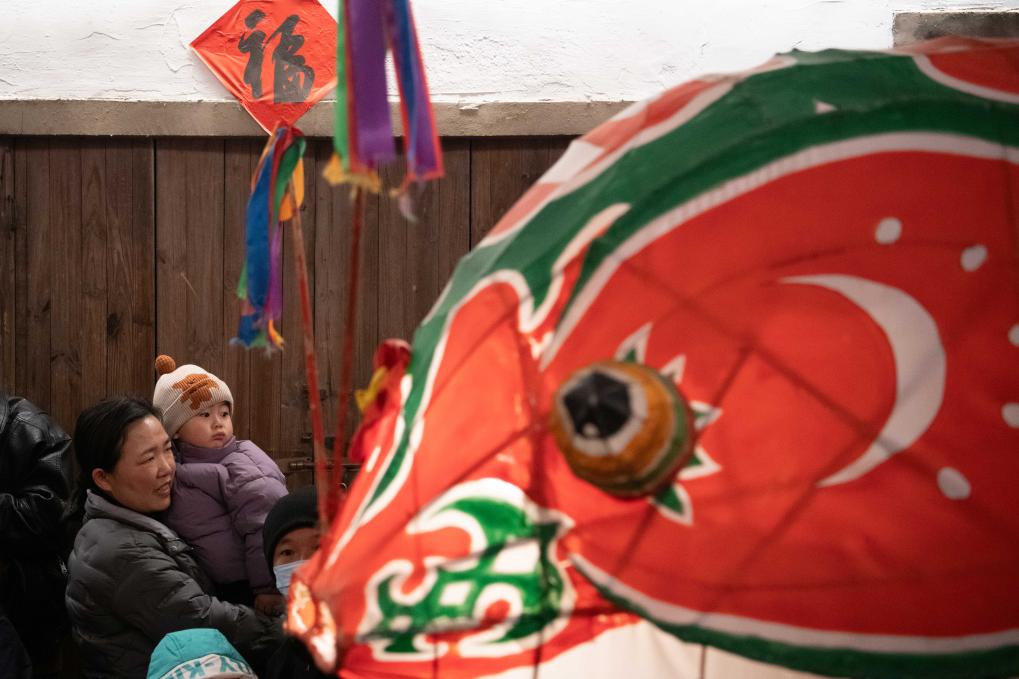 2025年1月10日,在安徽省黃山市歙縣北岸鎮瞻淇村,家長抱着孩子在觀看魚燈巡游。