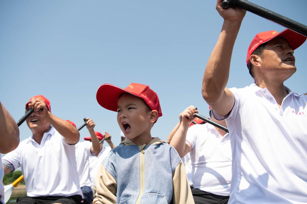 2025年5月29日,在安徽省宣城市涇縣桃花潭鎮,翟少宇小朋友(中)在喊龍舟號子。