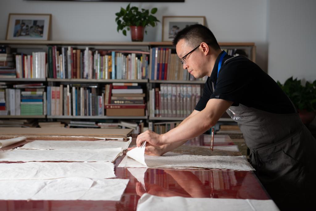 2025年8月5日,在安徽省圖書館,古籍修復師臧春華將經過清洗的書葉晾幹。