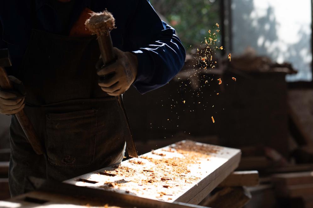 2025年1月6日,工人在黃山徽匠園林古建有限公司廠區加工徽派倣古建築所需木料。