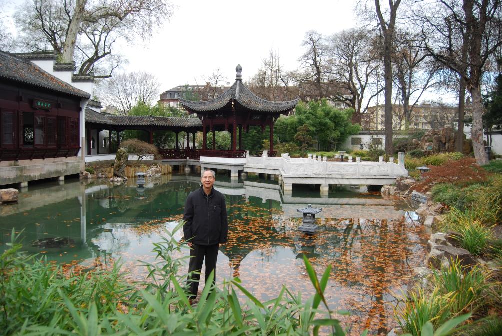 2007年10月,程極悅在德國法蘭克福市春華園整體維修提升工程現場拍照留念(受訪者供圖)。