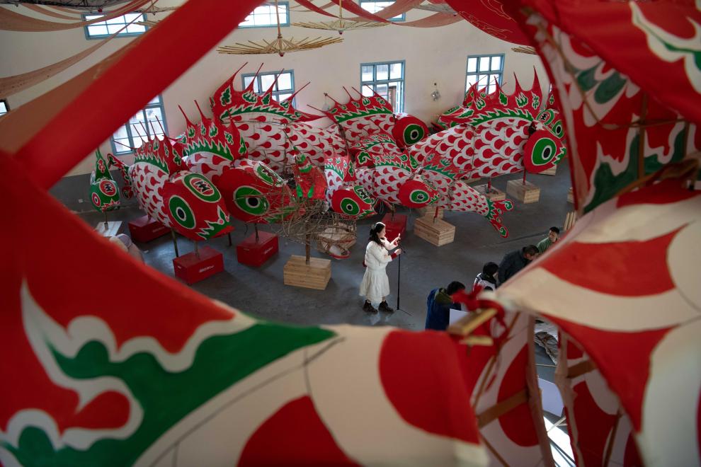 2025年2月8日,在安徽省黃山市歙縣溪頭鎮汪滿田村魚燈工坊內,游客(中)在記錄魚燈製作過程。