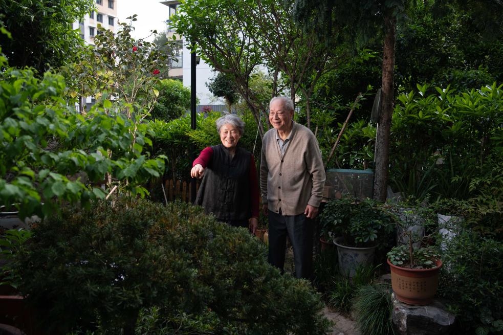 2025年4月10日,在安徽省黃山市屯溪區的家中小院裏,徽州古建築專家程極悅(右)與妻子童建英交流。