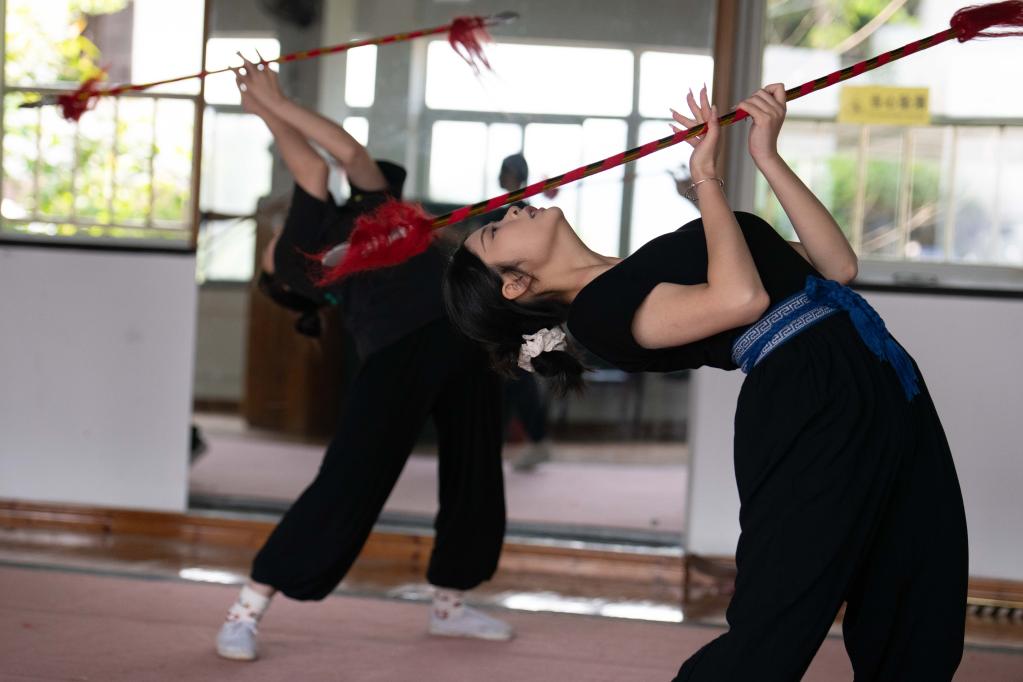 2025年4月29日,“00後”徽劇演員在黃山市徽劇院內練習徽劇的相關動作。