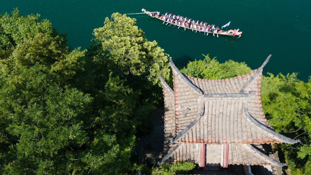 2025年5月29日,一支龍舟隊在桃花潭風景區劃龍舟。