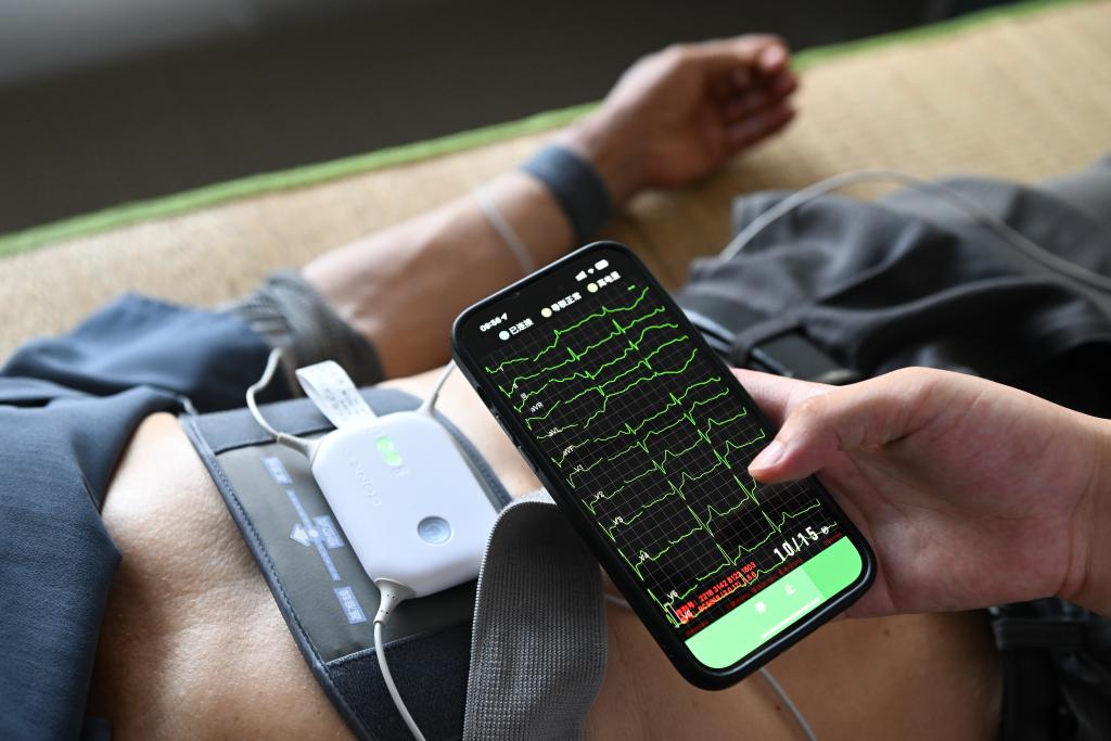 在江蘇省海安市曲塘鎮劉圩村衞生室,醫生為村民進行心電圖檢查。新華社記者 季春鵬 攝