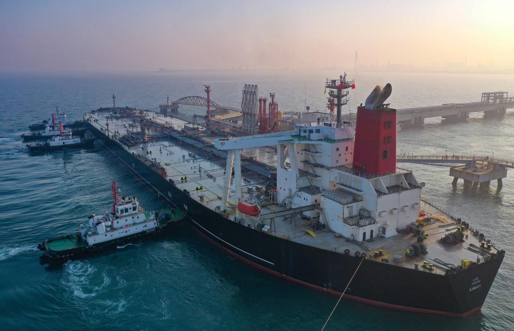 2025年12月18日,海南自貿港啟動全島封關,一艘裝載着17.9萬噸石化原輔料的船舶泊入國投洋浦油儲碼頭30萬噸級原油泊位(無人機照片)。新華社記者 郭程 攝