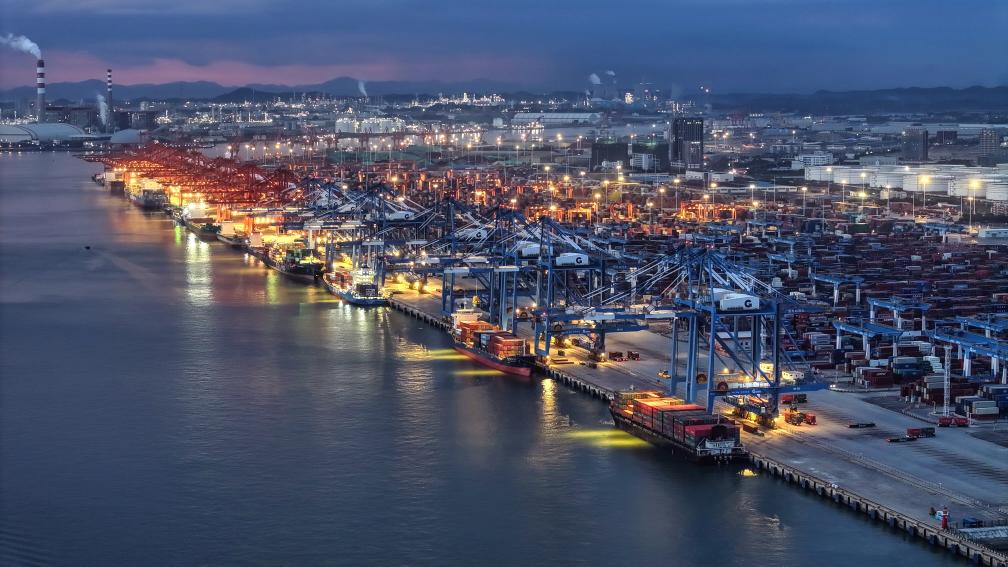 2025年9月16日,黃昏時分的廣西欽州港,龍門吊在作業(無人機照片)。新華社記者 張愛林 攝