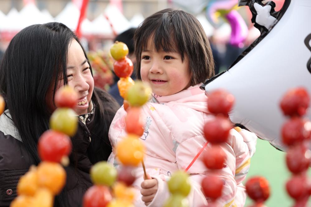家長和孩子在年貨大集上挑選糖葫蘆。新華社記者 陳斌 攝