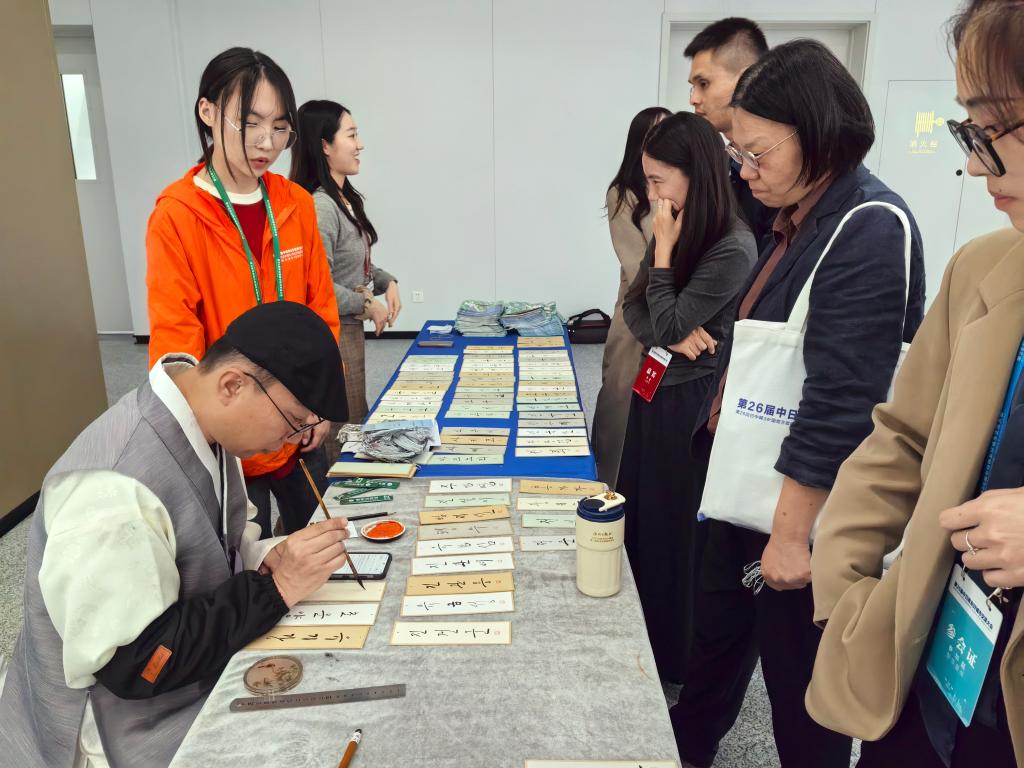 記者來到韓國文化體驗區看到,一張長桌上擺滿了寫有韓文的書簽,不少年輕的與會者駐足觀看,一名身着民族服裝的男子手握毛筆,對照着中文姓名,一筆一畫為參觀者留下姓名。不少參觀者感嘆,用毛筆寫出的韓文如此飄逸靈動。
