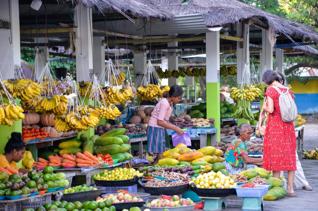 2022年6月4日,在東帝汶首都帝力,人們在一家水果市場購買水果。新華社記者徐欽攝