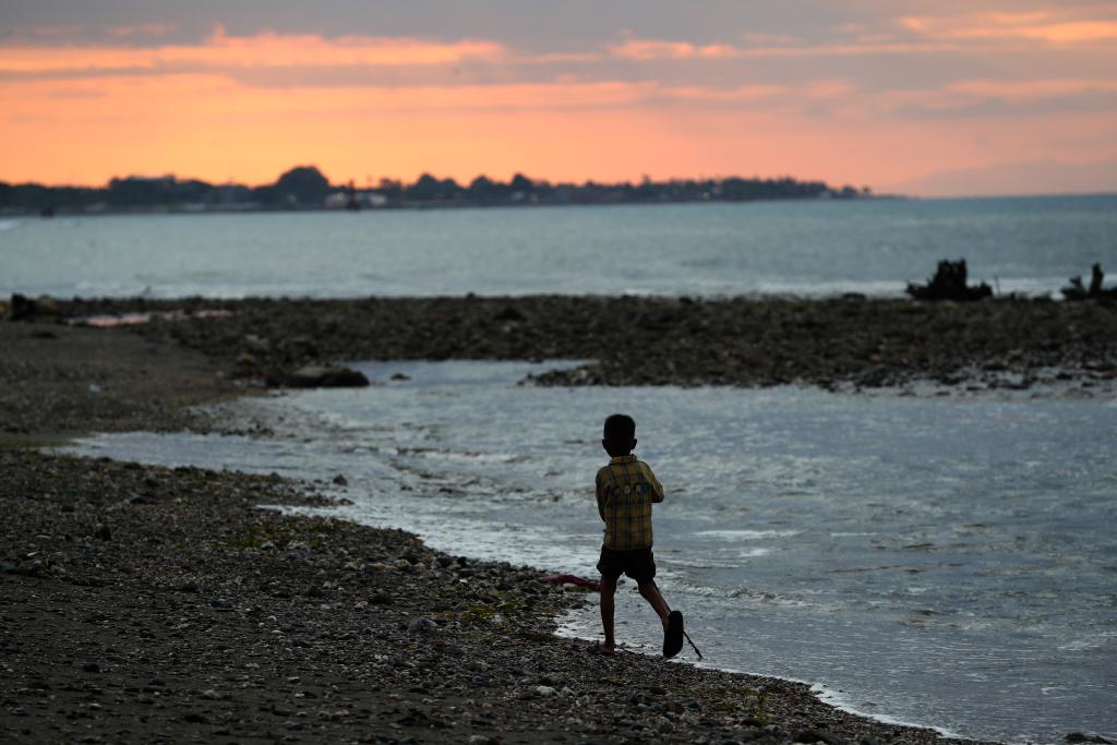 2025年9月17日,在東帝汶帝力的海灘上,一名兒童在海邊跑步。新華社記者岑雲鵬攝