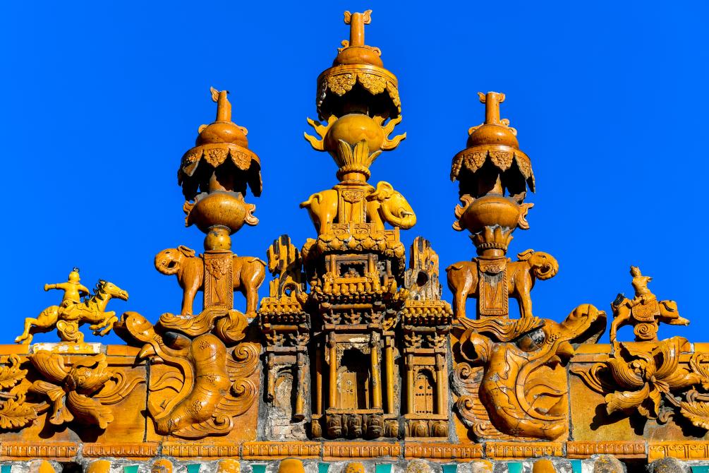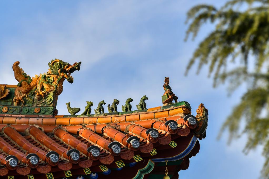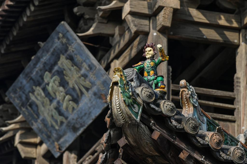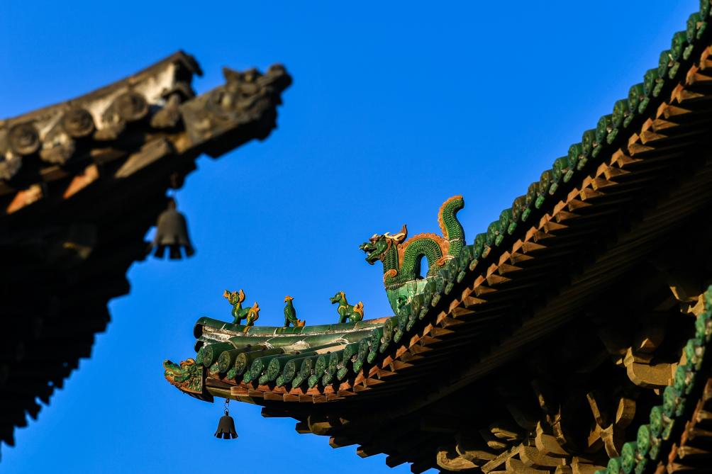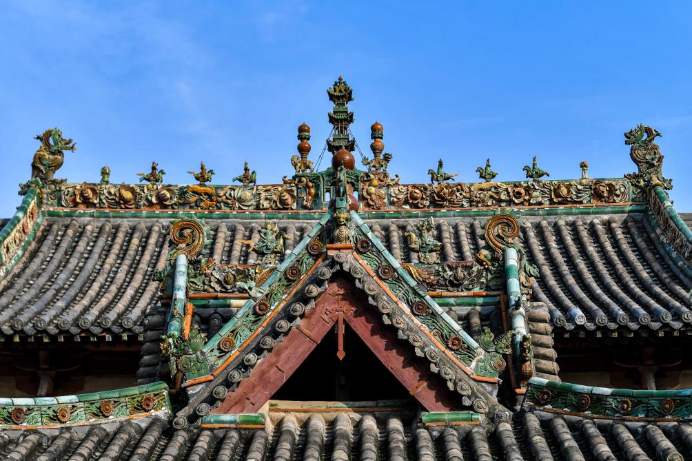 在山西觀賞古建築,時常需要抬頭仰望,站立塔頂、騎於屋脊、蹲在房檐上的“精靈”們造就光彩奪目的“大千世界”,讓游客讚嘆不已。