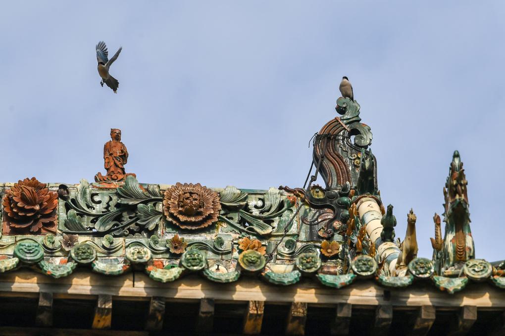 這是11月14日在山西省運城市解州關帝廟拍攝的古建頂上的裝飾構件。