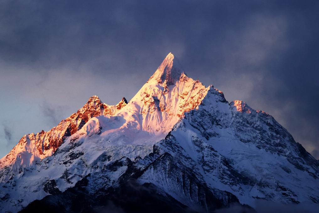 12月3日清晨,雲南梅裏雪山在雲海中若隱若現,在陽光照射下呈現出“日照金山”的壯麗景觀。