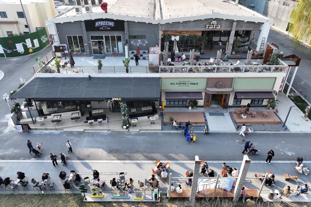 12月4日,游人在西安時光文化公園消費休閒(無人機照片)。這座公園是由西安國營第一鐘錶機械廠舊廠區改建而來的。