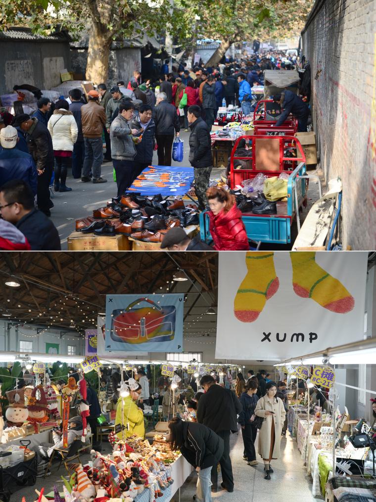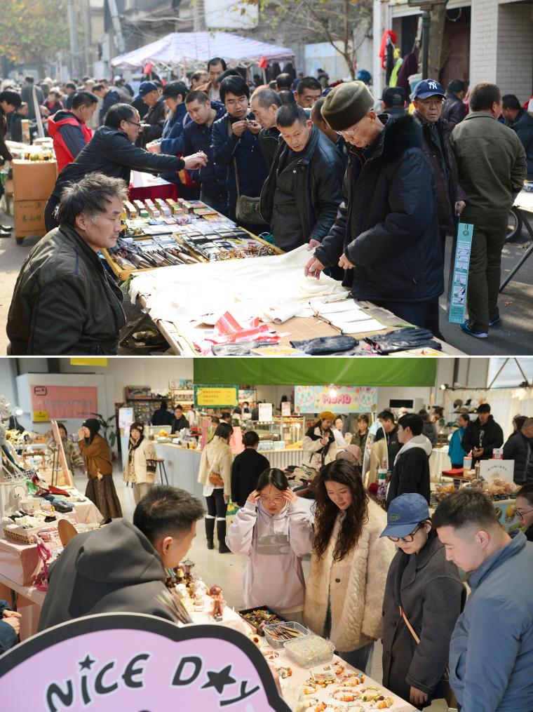 拼版照片:上圖為游客在位於西安市蓮湖區的老西倉市集上選購商品(2016年12月1日攝);下圖為游客在改造後的西安西倉市集文創公園一處市集上選購商品(2025年12月6日攝)。