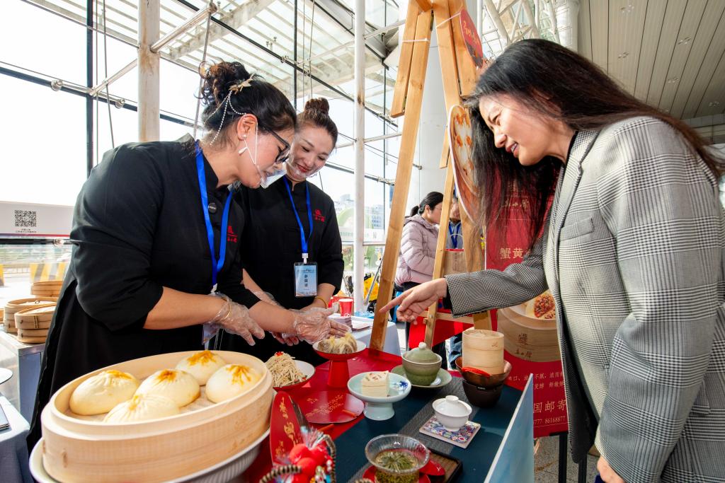 12月5日,工作人員在泰州站給旅客介紹泰州早茶。