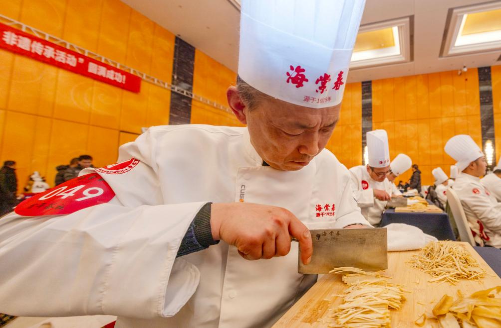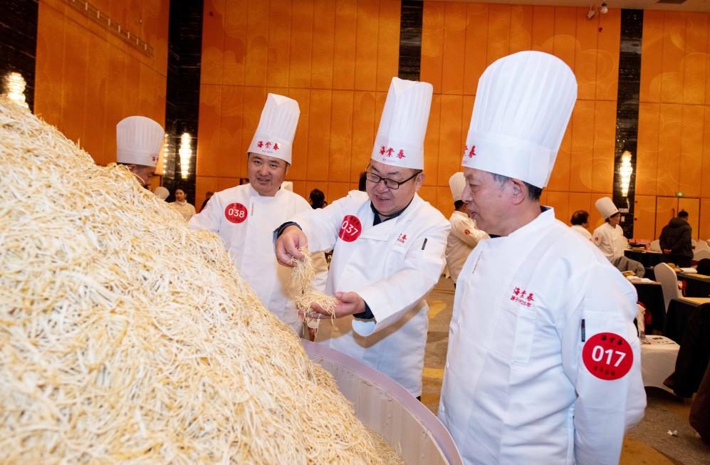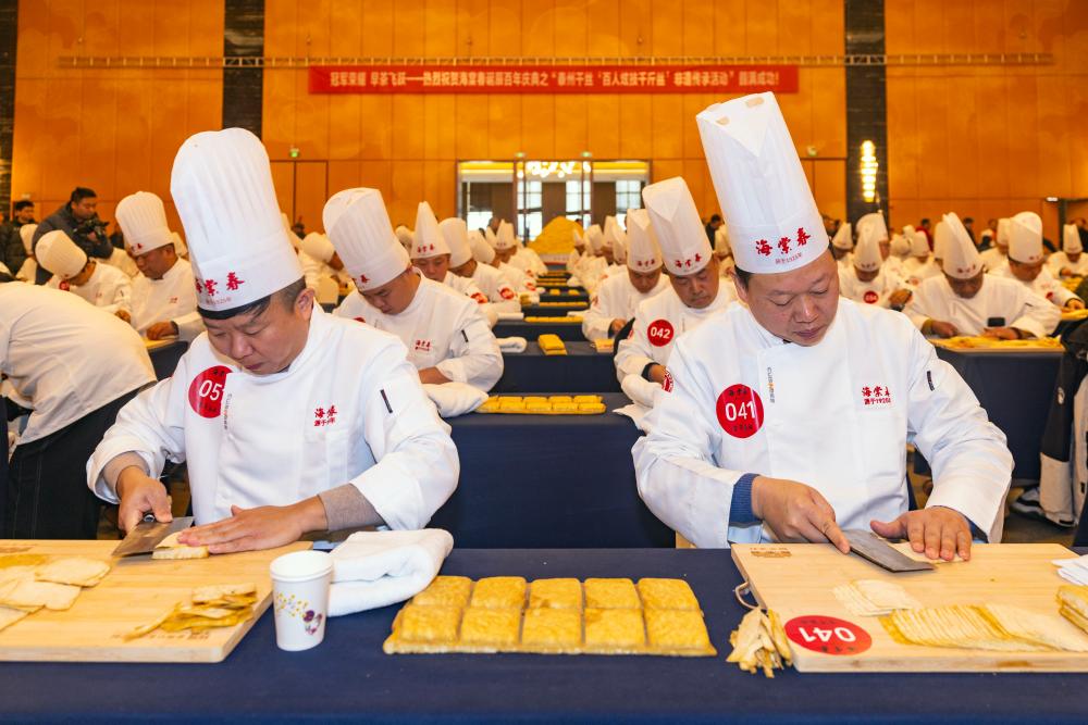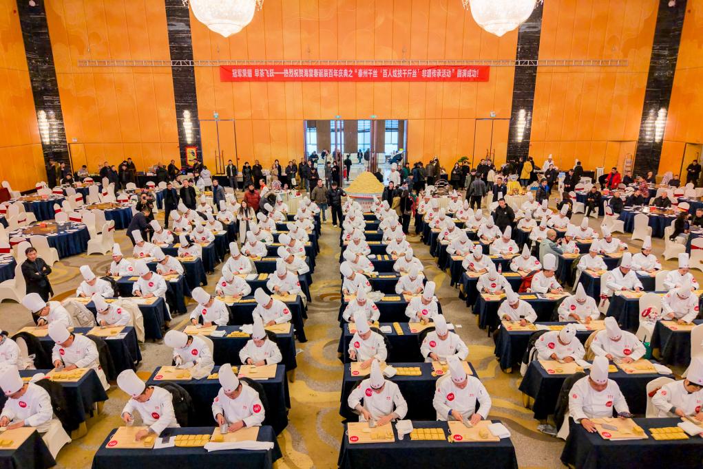 12月23日,泰州早茶“百人炫技千斤絲”非遺傳承活動在江蘇省泰州市海陵區泰州賓館舉行,百位幹絲製作師傅同&獻藝,展示泰州早茶中乾絲的製作技藝。目前,泰州早茶已形成標準化體系,當地政府將持續深化文商旅融合,助推泰州早茶産業發展。