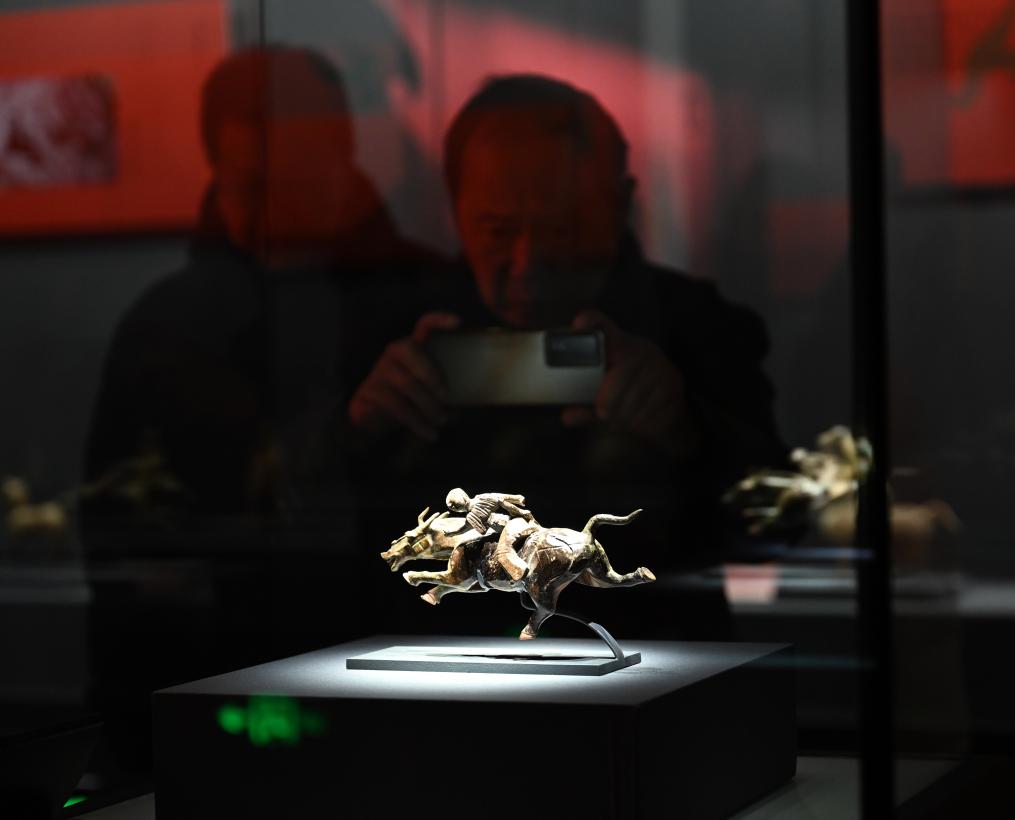 1月1日,市民在鄭州大象陶瓷博物館觀看漢代綠釉勇士騎飛奔馬俑。新華社記者 李嘉南 攝