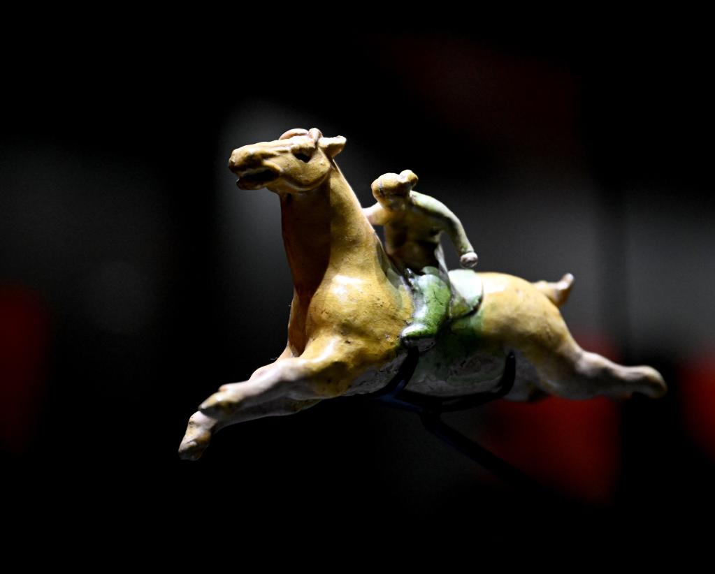 展覽中,多件漢、唐時期的騎馬俑極富動感,其中一件漢代綠釉勇士騎飛奔馬俑尤為傳神,駿馬三蹄騰空、作疾馳狀,馬背上的武士挎弓持刀,神情冷峻,仿佛正傳遞緊急情報。
