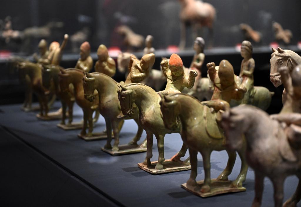 1月1日,這是此次展出的唐代青釉彩繪伎樂騎馬俑。新華社記者 李嘉南 攝