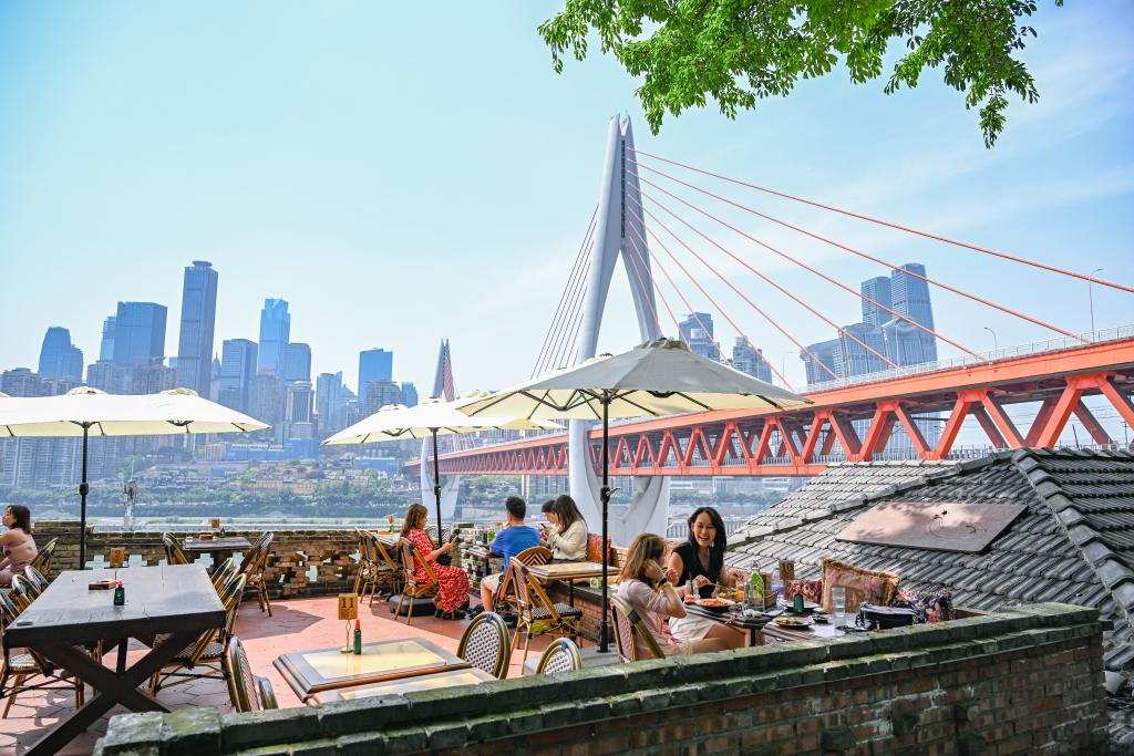 2025年5月1日,游客在重慶市南岸區龍門浩老街一餐廳用餐。