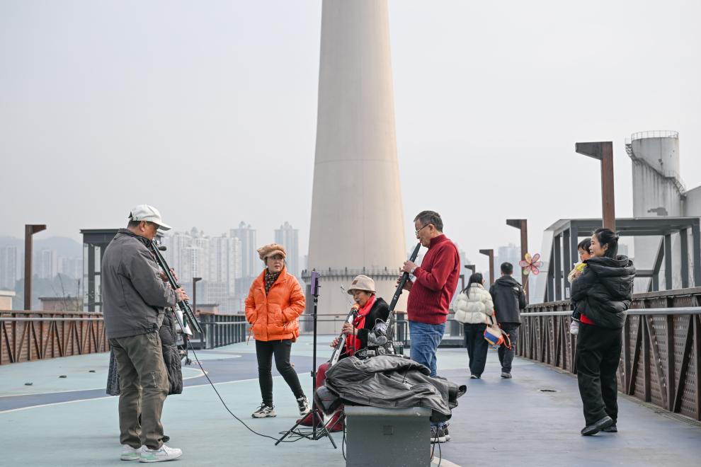 1月5日,市民在重慶九龍坡區藝術公園練習樂器。