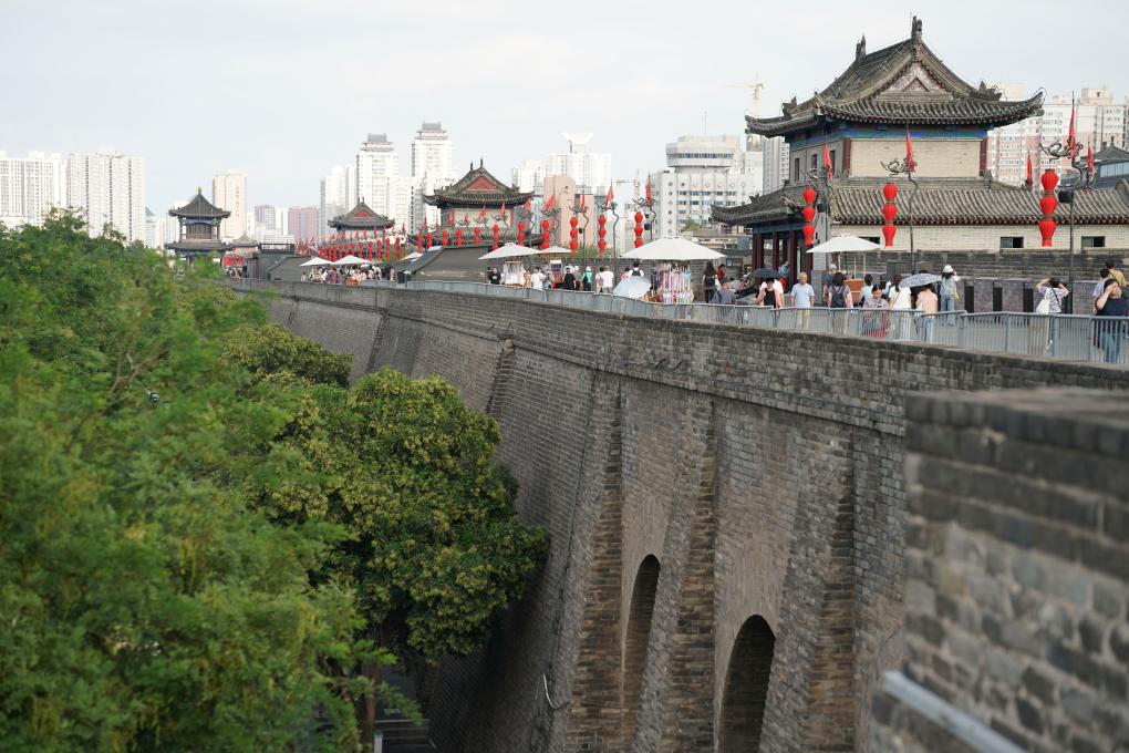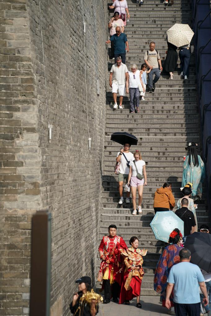 游客在西安城墻上游覽(2025年9月12日攝)。
