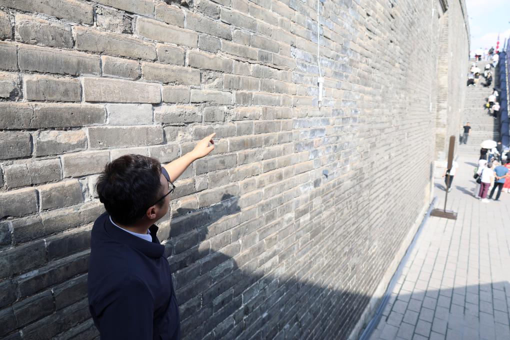 游客在西安城墻永寧門內游覽,左側城墻上布設着城墻病害數據傳感監測設備(2025年9月12日攝)。