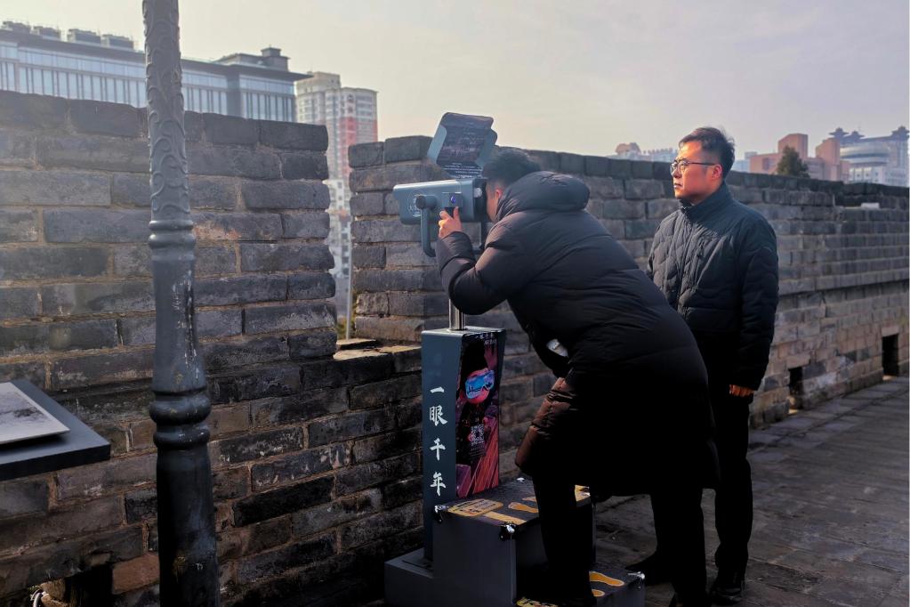 2026年1月5日,趙彬(右)在西安城墻上檢查城墻的“一眼千年”AR望遠鏡設備。