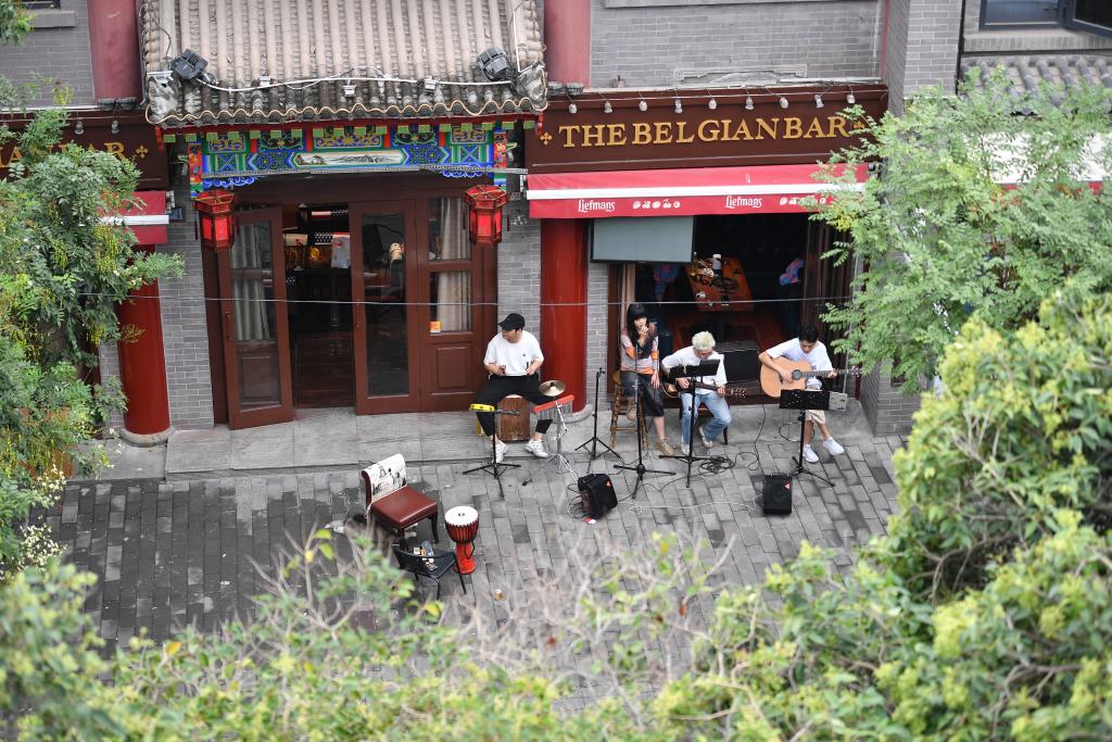 在西安城墻內側順城巷邊的一家小店外,一支樂隊在排練(2025年9月10日攝)。