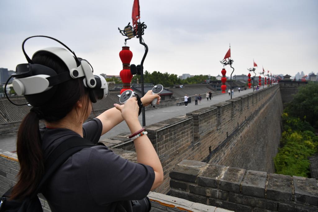 游客在西安城墻一處馬面上體驗一款以射箭守城為主題的MR混合現實游戲(2025年9月10日攝)。