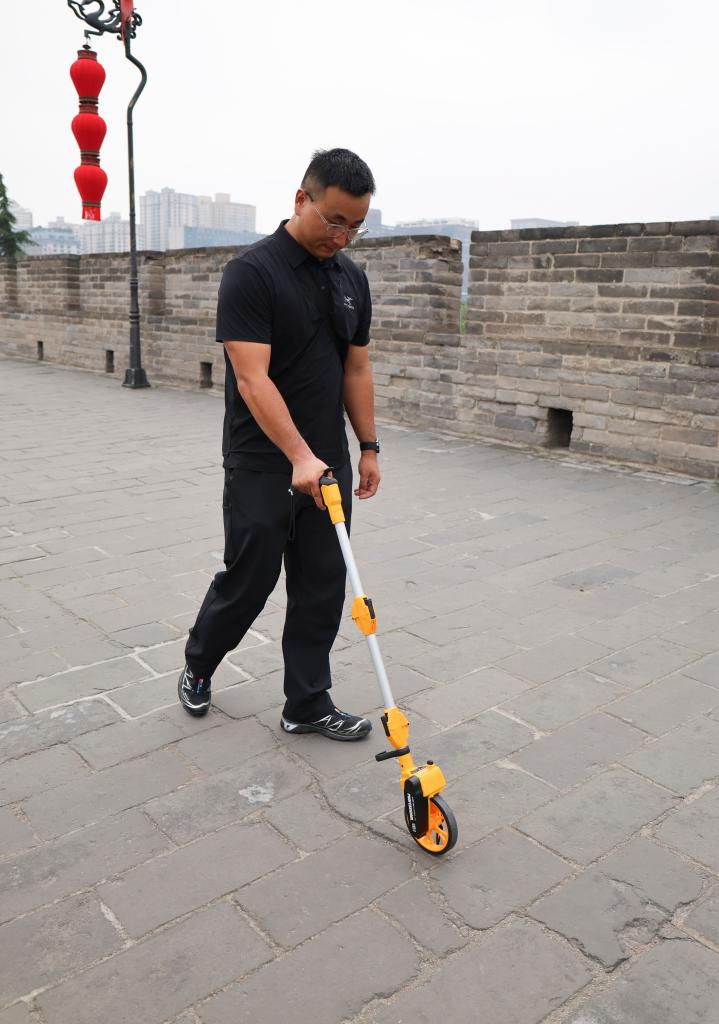文保巡查員在西安城墻上測量海墁裂縫長度(2025年9月10日攝)。