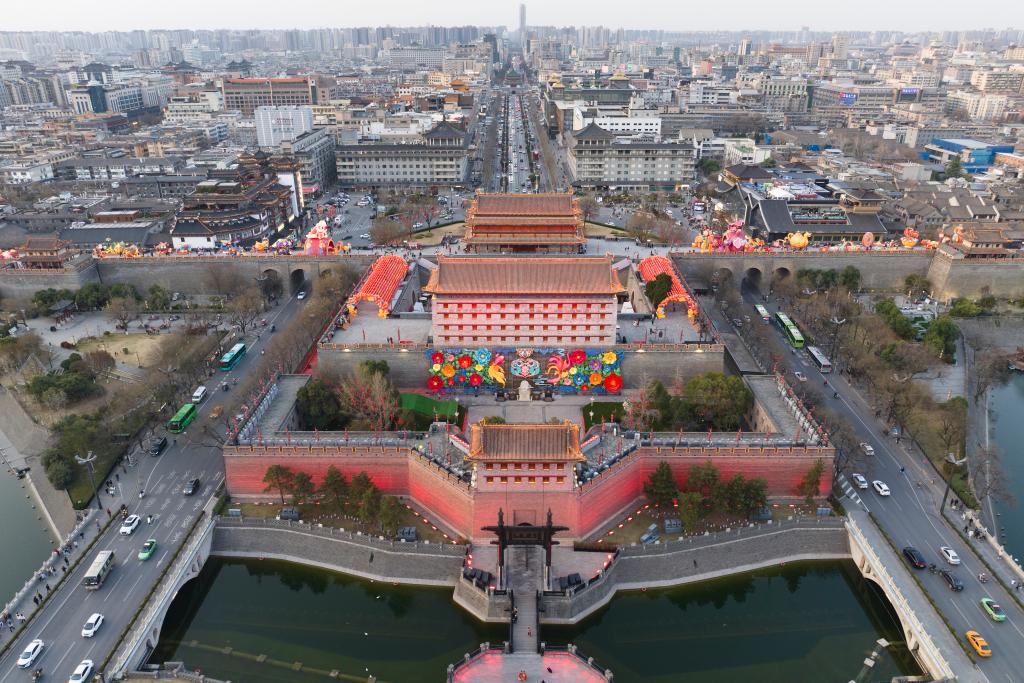 由南向北俯瞰西安城墻永寧門(2025年3月19日攝,無人機照片)。
