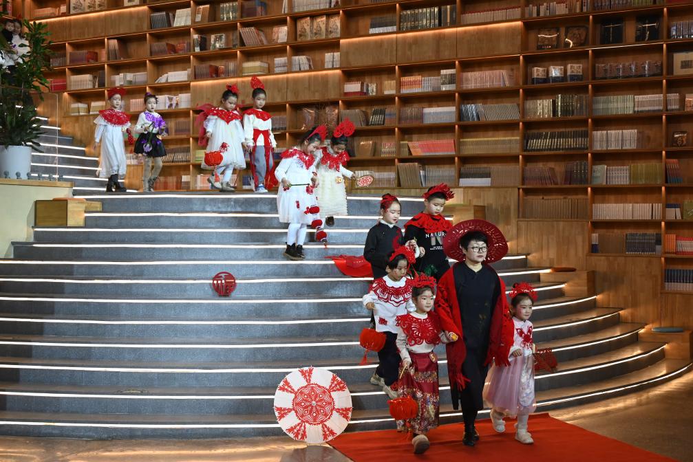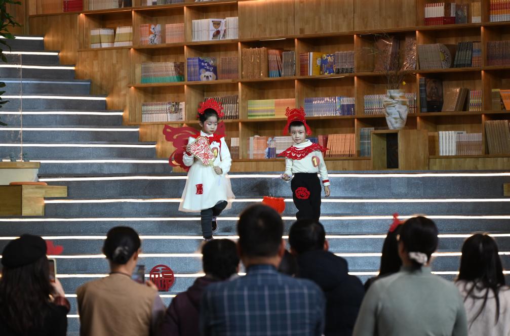 1月11日,在甘肅省敦煌市敦煌無界,十余名小朋友以走秀方式,展示自己創作的剪紙服飾作品,感受非遺魅力。